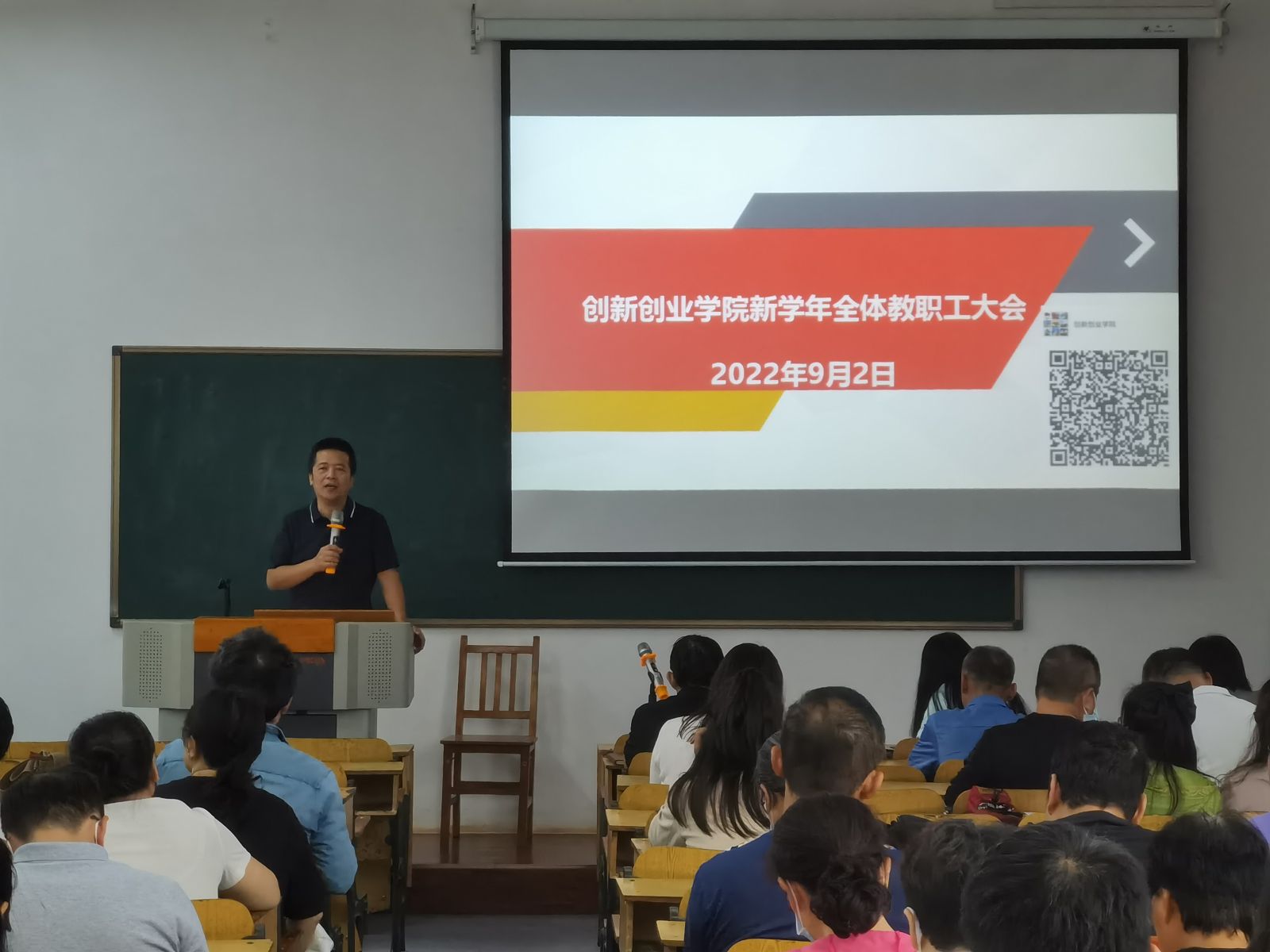 在学院A座202教室召开新学期全院教职工大会,全体教职工参会,院长王黎明主持会议并对新学期的工作做了安排部署。