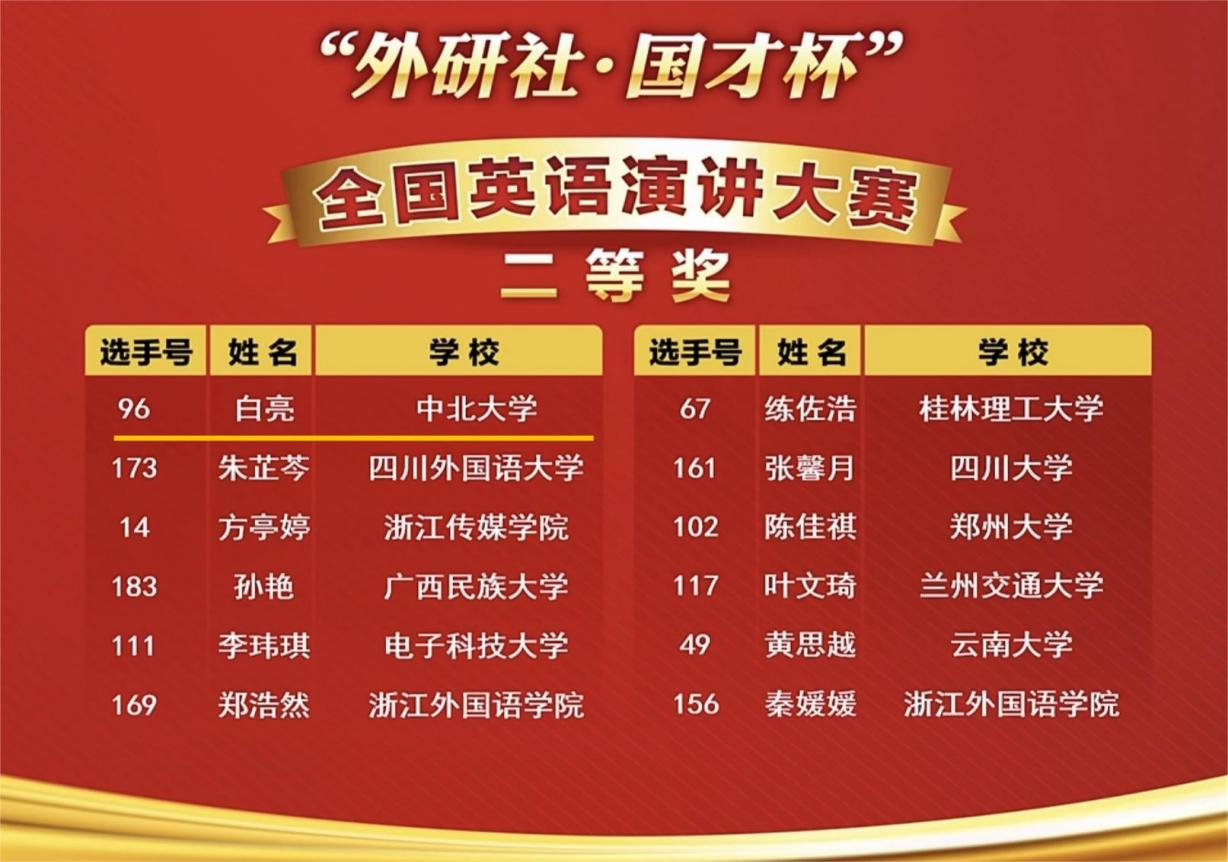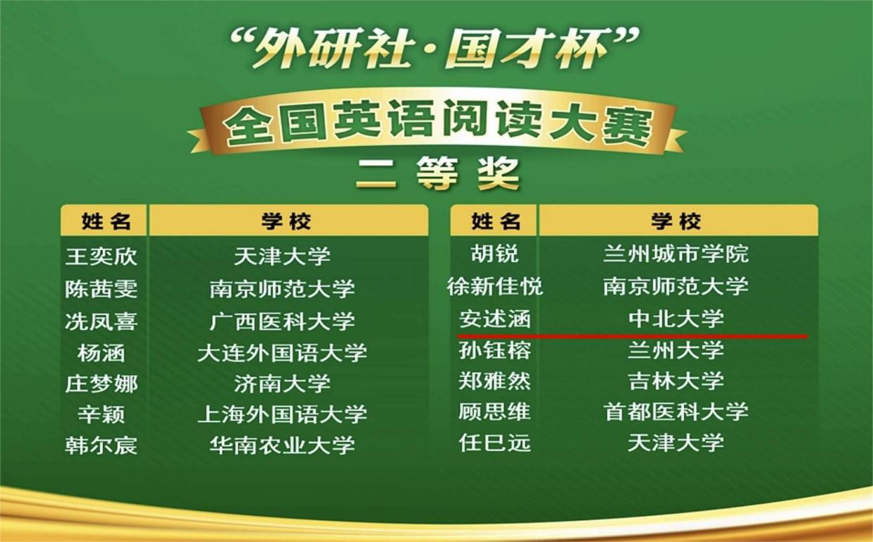 大赛得到了校院两级的大力支持,人文学院竞赛团队认真筹备、组织,指导教师精心指导,参赛学生认真备赛,师生共同努力,最终在全国决赛中取得了骄人的成绩:2020级英语专业本科生白亮在全国183名参赛选手中脱颖而出、顺利进入全国88强,以标准的发音、敏捷的思维、稳健的台风,最终荣获2022“外研社 ·国才杯”英语演讲全国二等奖;2019级英语专业本科生安述涵以山西省第一名的成绩晋级2022“外研社 ·国才杯”英语阅读全国决赛,充分发挥自己的知识广度、人文积淀,展现了自己的信息获取、分析和提炼整合综合能力,一举获得国家级二等奖。2020级英语专业本科生陈洁凭借独特的创意构思和逻辑归纳、辩证思考及解决问题的能力,最终摘得国家级三等奖 。