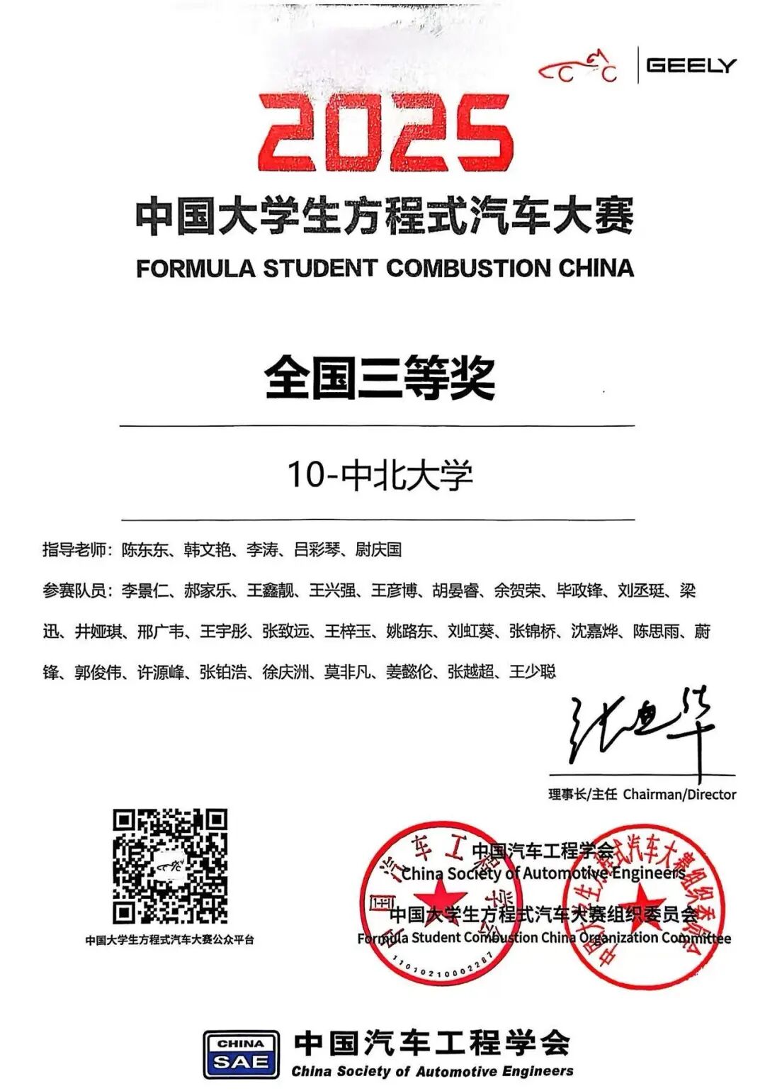 在2025中国大学生方程式汽车大赛中喜获佳绩